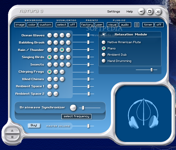 Kompüterinizin başında işinizlə məşğul olarkən bir tərəfdən sanki bir şəlalənin və ya dənizin sahilindəymişsiniz də su səsləri ilə birlikdə müxtəlif təbiət səslərini dinləyərək rahatlamaq istəməzsinizmi? O zaman bu proqram tam sizə görədir.Natura Sound Therapy bir musiqilə müalicə (rahatlama, stress götürmə) proqramıdır. İçərisindəki təbiətdən su səsləri, quş, böcək, qurbağa səsləri ilə rahatlaşdırıcı bəzi musiqi alətlərinin səslərindən istədiklərinizi seçərək özünüzə uyğun rahatlaşdırıcı musiqilər meydana gətirə bilərsiniz. Bir tərəfdən işinizi edərkən bir tərəfdən də bu rahatlaşdırıcı musiqinin yoldaşlığında başınızı dinləyə bilərsiniz.Proqram geniş və fərdiləşdirilə bilər səs effektləri ehtiva edir. Ayrıca müxtəlif tezliklərdə "beyin dalğası sinxronizasiya" şəklində ifadə edilə bilən bir səs çıxardır. Məqsədinizə uyğun (məsələn: yuxu, istirahət etmə, enerji artırma, konsentrasiya vs.) tezlik və effektləri seçə bilirsiniz.