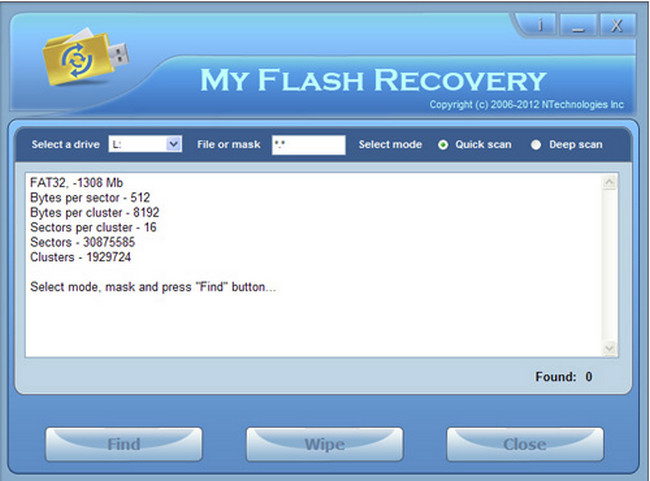 NTechnologies My Flash Recovery, flash kartlardan və cihazlardan məlumat qurtarma üzərinə mütəxəssisləşmiş bir proqramdır. NTechnologies My Flash Recovery Windows NT,2000,XP,2003,Vista/Windows 7 əməliyyat sistemlərini dəstəkləməkdədir.