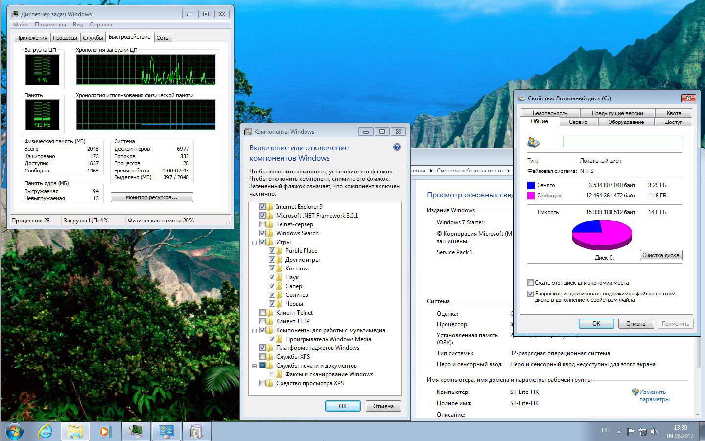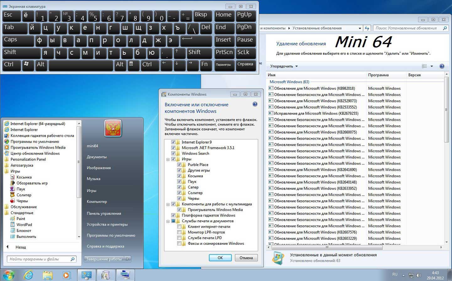 Framework 2.0-3.5, Qiymət, qayçılar, Wi-Fi, proyektor. Printerin quraşdırılmasından əvvəl (qarşısında) - avtomata qoyun və PU-da çapın Dispetçerini buraxacaqsınız, İnzibatçılıq etmə, Xidmətlər. Mini-də işləmir - komponentlərin (yalnız göstərir) seçimi, Bir halda ki, wisxs keşləri yoxdur, və bütün təzə şeylər qurulmayacaq. Office 2010, həmçinin oyunlar üçün dəst - Framework 4.0, Silverlight-5, Visual C++ SP1 2005-2010, DirectX 9.0 c, Live, SunJava, OpenAL, Flash, PhysX - qurulacaqlar. Redaksiyaların adları - Starter, Home Basic, Home Premium, Professional, Enterprise.Enterprise və Professional aktivləşdirməsi - aktivator mini-KMS, və Starter, Home Basic, Home Premium (Professional - həmçinin olar) - loader vasitəsilə.