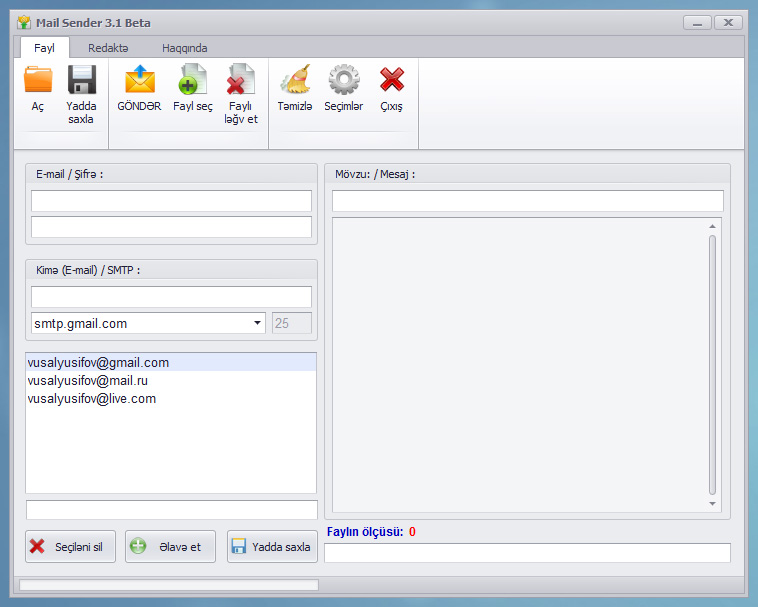 Mail Sender proqramı 3.1 Beta versiyası bəzi yenilikləri ilə sizlərə təqdim edilir.Proqramın dizaynı dəyişdirilib və rahat mesaj yazmağınız üçün alət paneli əlavə edilib.Əvvəlki versiyalarda olduğu kimi bu versiyada da fayl göndərmə (maksimum 20 MB), SMTP adresi seçimi, Port seçimi funksiyaları əlavə edilib.Proqramdakı yeniliklərdən biri "Skin" dəstəyidir.Əlavə olaraq .txt faylı açma, yadda saxlama, mesaj yazma bölməsi Unicode dəstəyi (ə,i,ö,ü,ç,ş,ğ) mövcuddur.Proqramda artıq E-mail bazası mövcuddur.E-mail göndərərkən hər dəfə e-mail adresini yazmağa ehtiyac qalmayacaq.Bazadan birbaşa əvvəl istifadə etdiyiniz e-mail edresini əlavə edə biləcəksiniz.